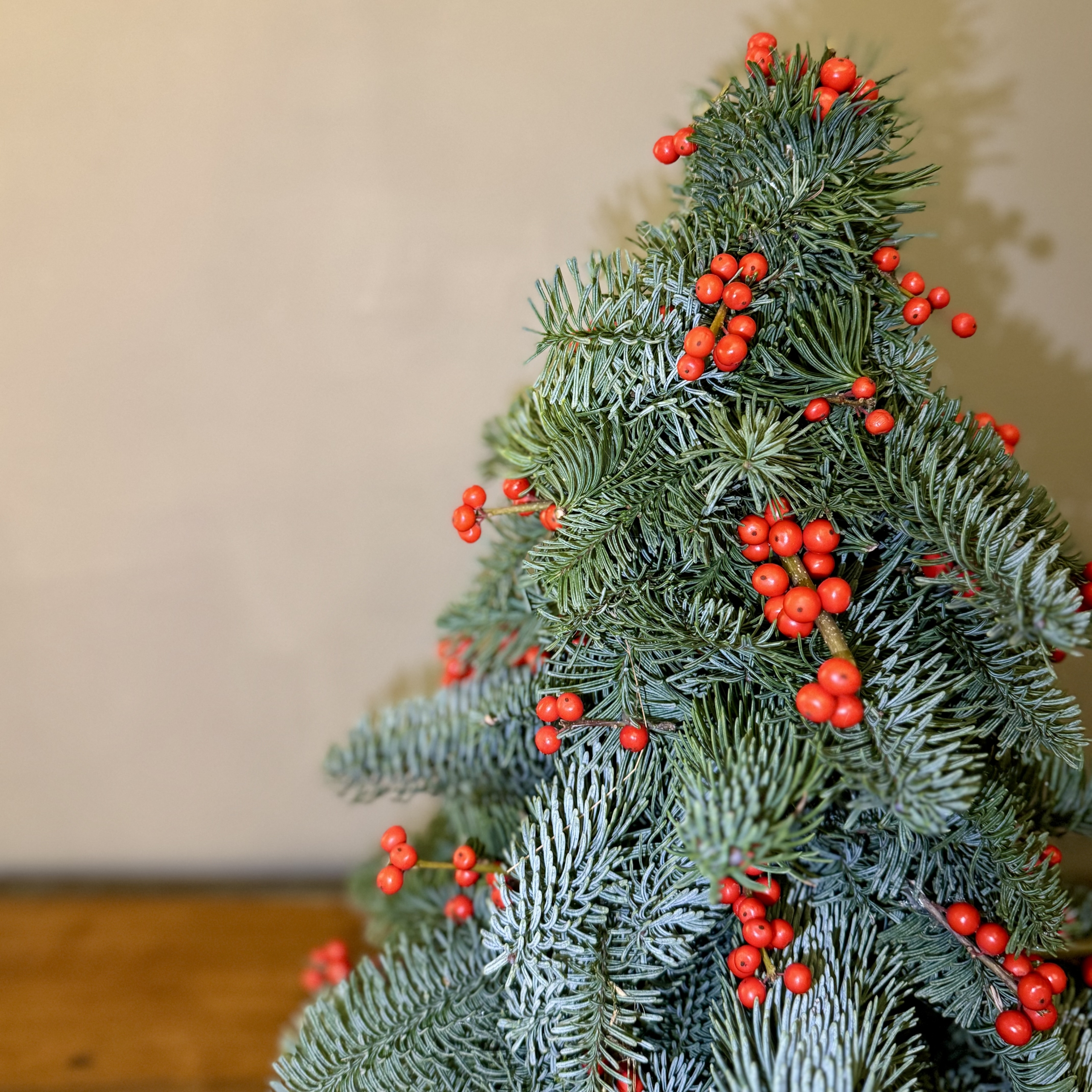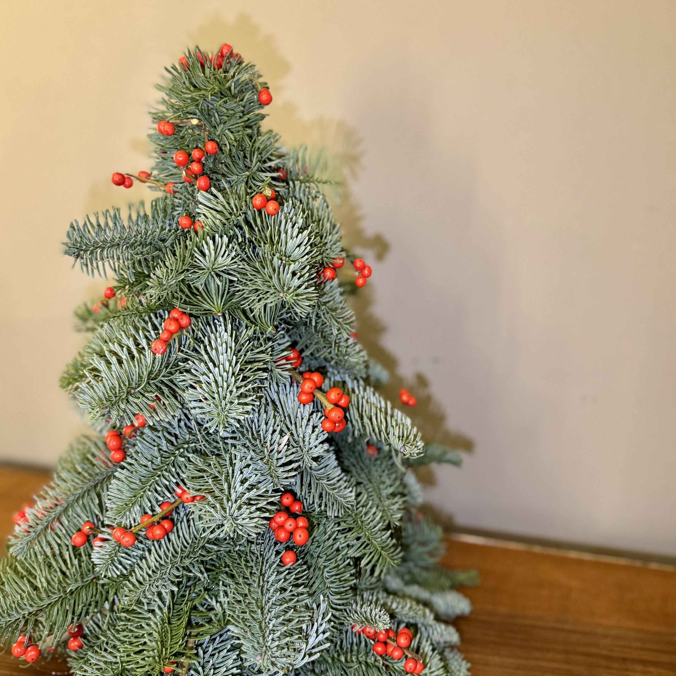 Carinissimo e delicato alberello di Natale realizzato con pino argenteo e rami di ilex con le sue peculiari bacche rosse.La struttura viene interamente realizzata a mano con rami di pino scelti.