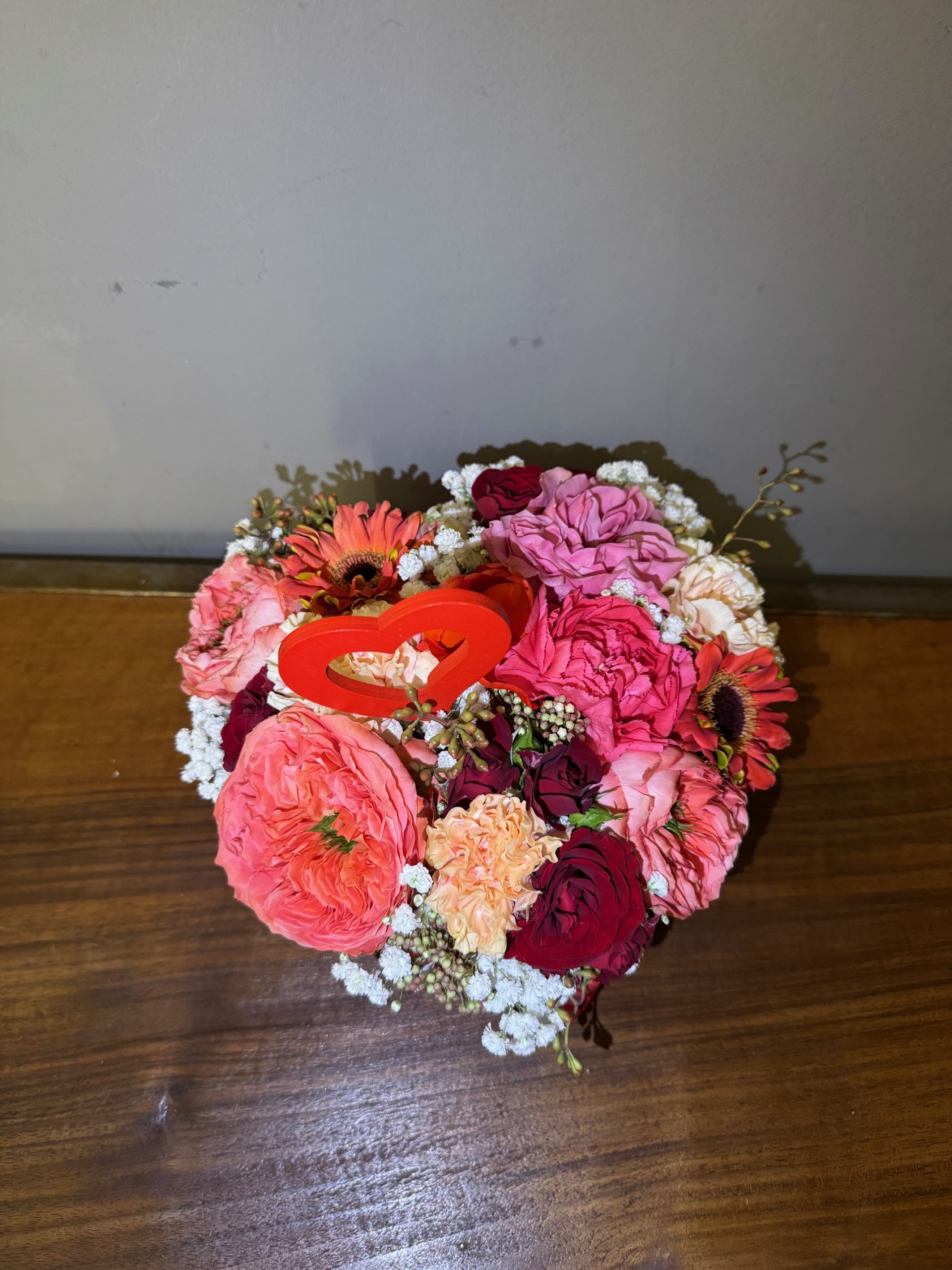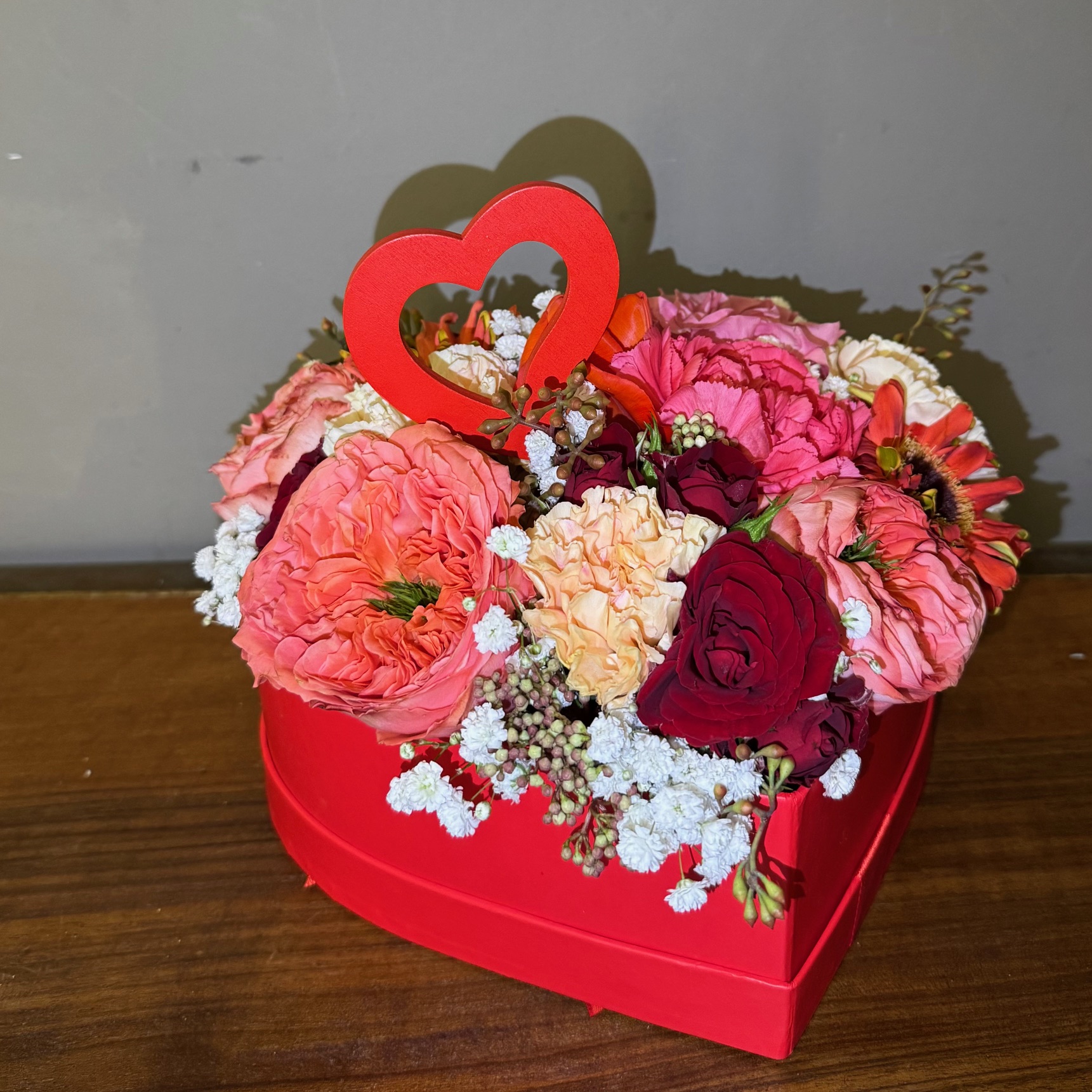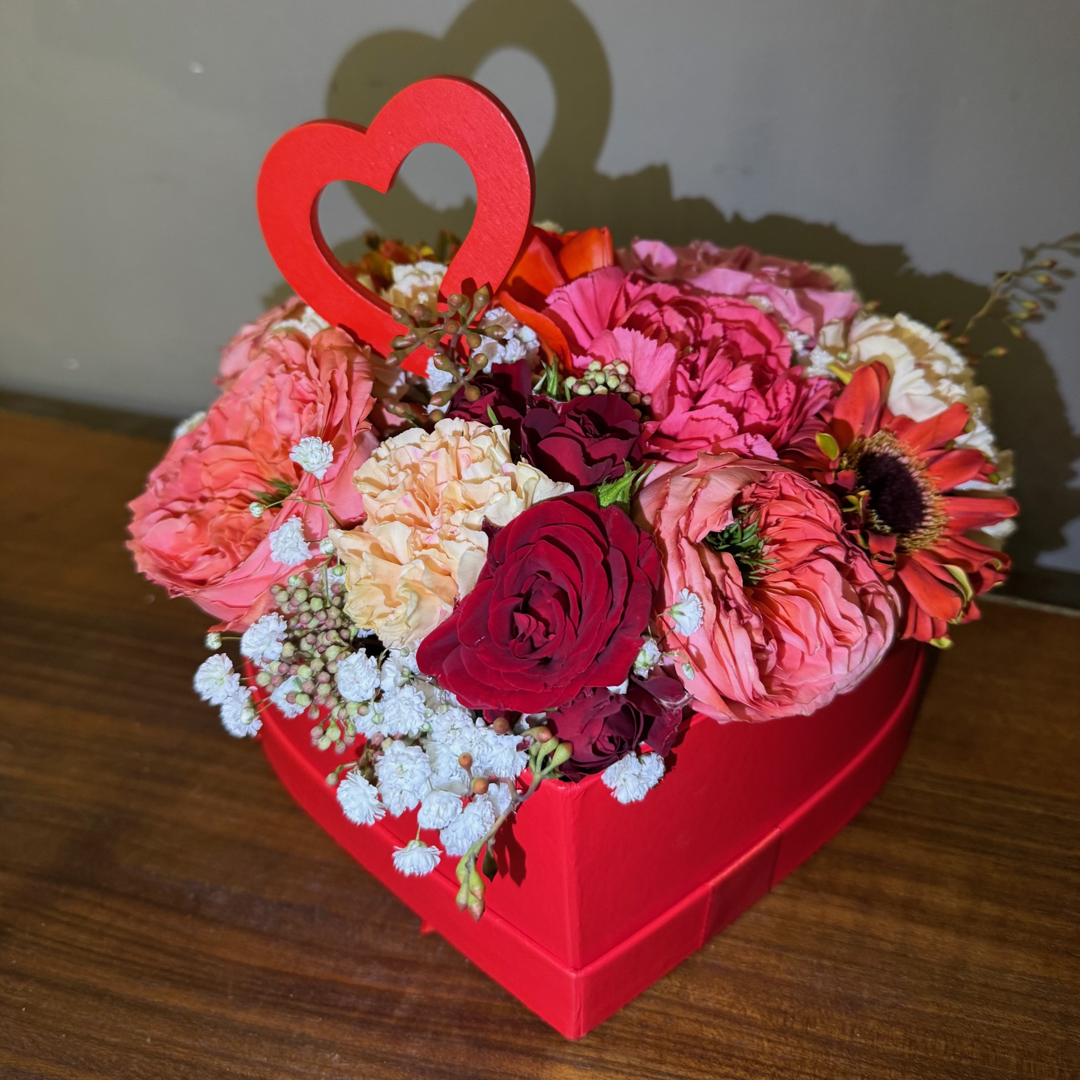 Splendida flower box a forma di cuore rosso con dettaglio di San Valentino all’interno.
